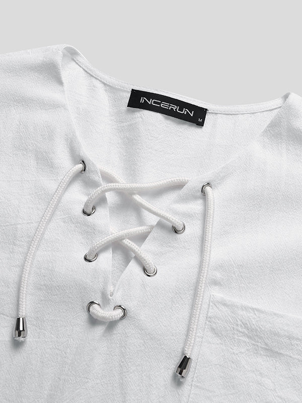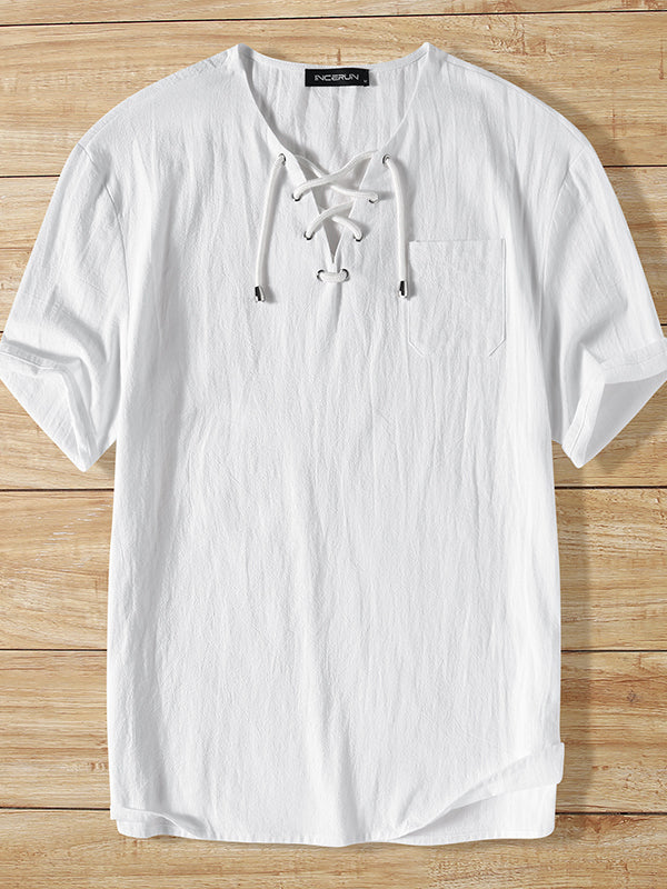 Mens Eyelet Drawstring Casual Short-sleeved Shirts SKUI90676