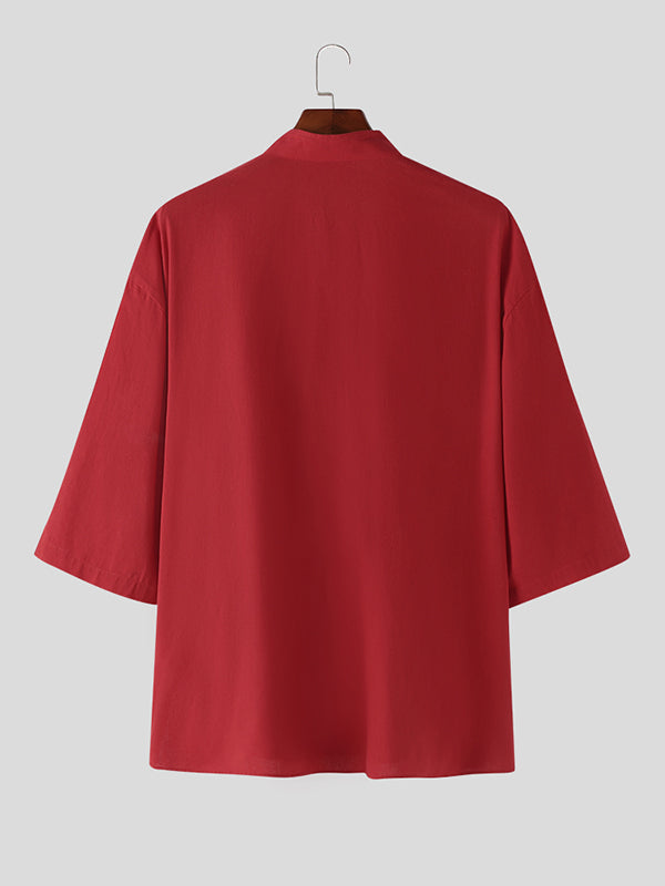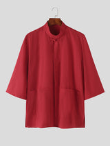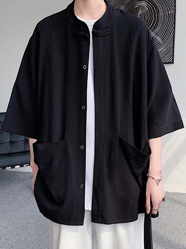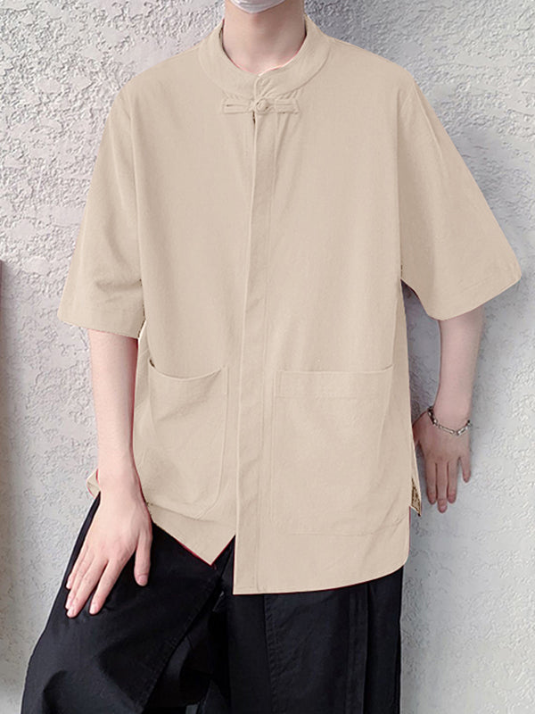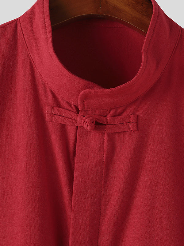 Mens Stand Collar Frog Button Cotton Shirt SKUK34678