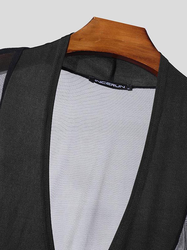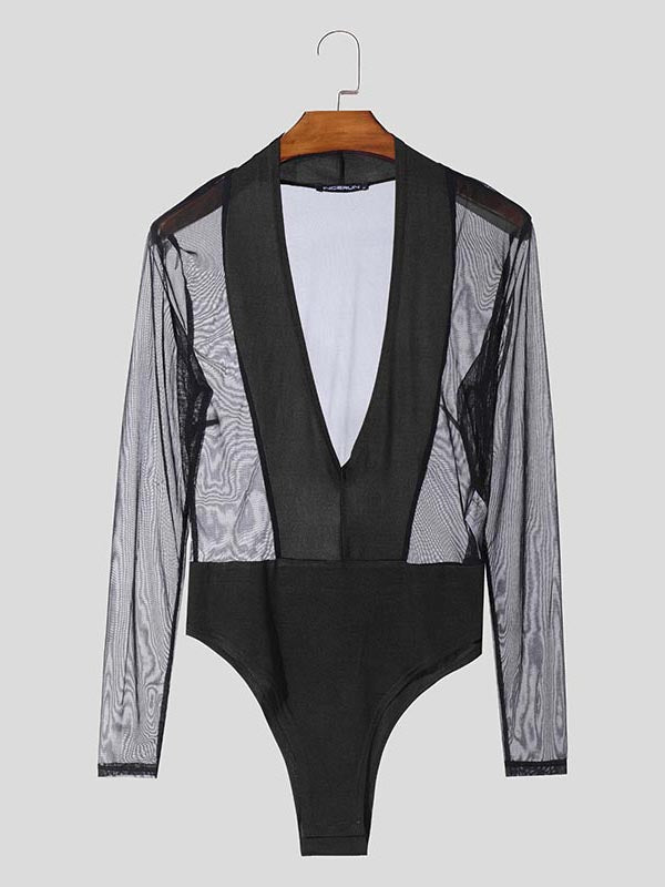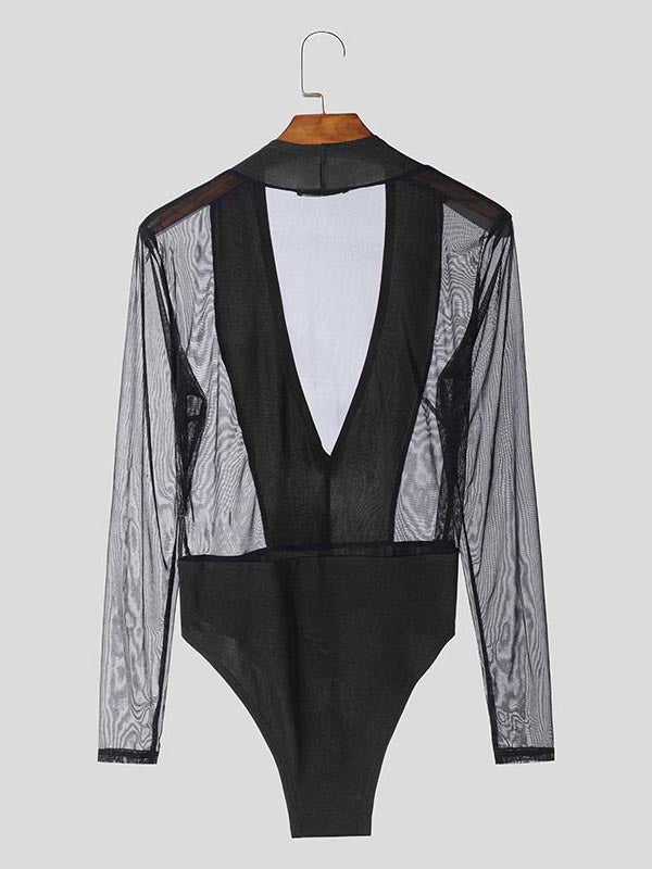Mens Sexy Mesh Patchwork Long Sleeve Bodysuit SKUK98848